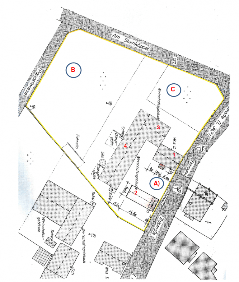 Dem beigefügten Lageplan können sie die Aufteilung des Grundstücks in drei Bereiche (A,B,C) entnehmen.